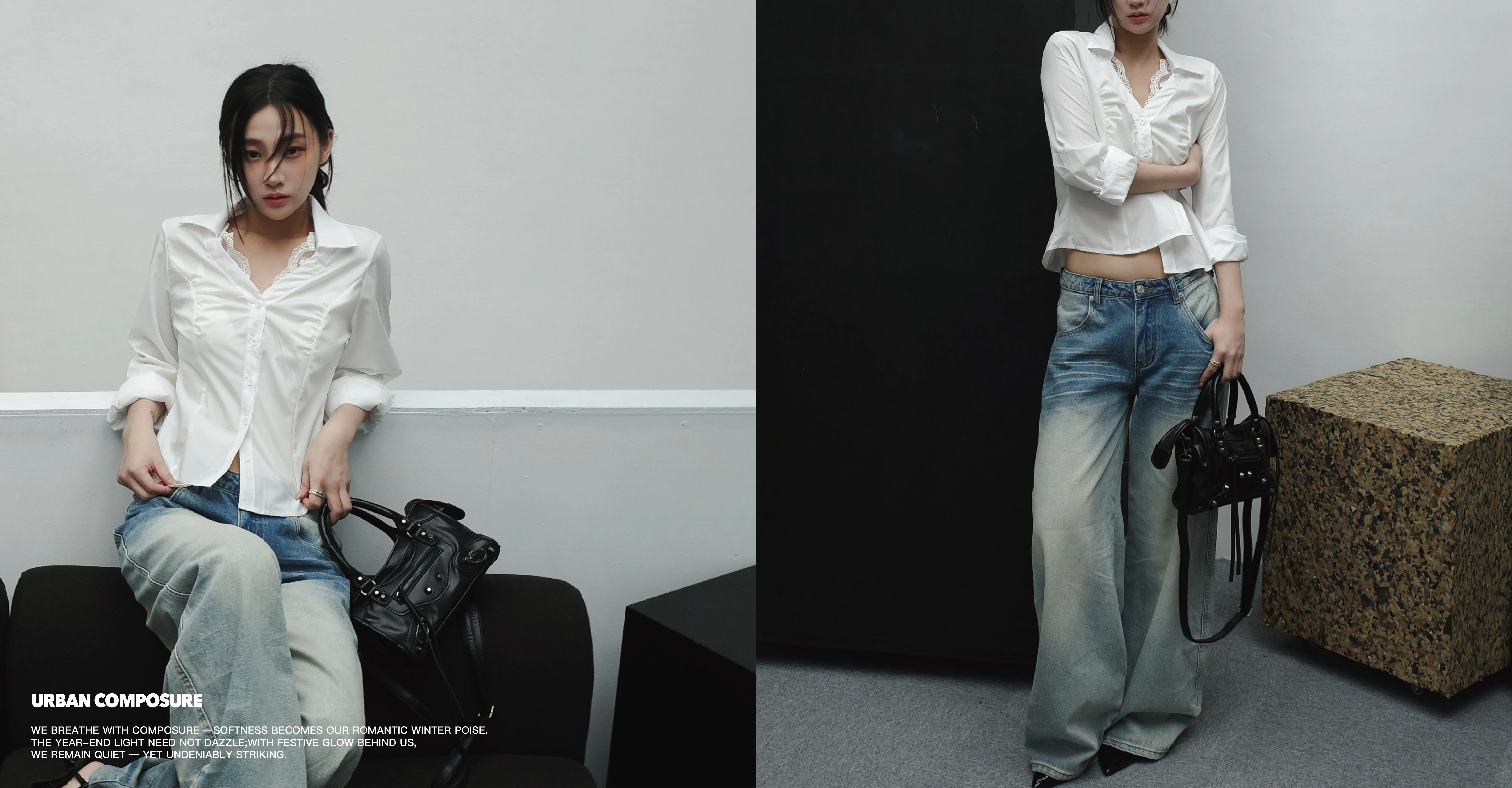 NM001-WHITE 翻領拉鍊剪裁短版上衣